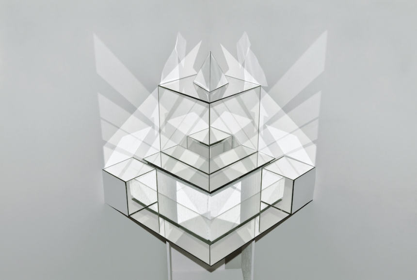 Her group of ‹Blitzlicht-Skulpturen› (flashlight sculptures) was created in 2013. The setting follows a strict arrangement. Like architectural models, glass structures composed of shapes of cubes, slabs, and pyramids are positioned on the stage of a black plinth or white table. Something theatrical happens on it. The camera flashes. Reflective surfaces reflect the light onto the walls, catch these light forms again and connect the perspectival surfaces and lines to an illusion: the concrete moves into the background, the light as a sculpture enters the room; as soon as the eye suspects it, only the photograph remains as a witness to its existence. Teufen’s tableaus explore border areas. What already is architecture? What is sculpture? What, in turn, is photography?